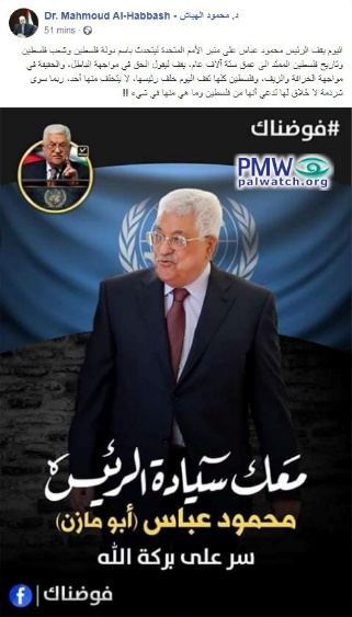 Posted text: "Today [PA] President [Mahmoud Abbas] will stand on the UN podium in order to speak on behalf of the State of Palestine, the Palestinian people, and the history of Palestine that extends to a depth of 6,000 years in order to assert the truth against the lie and the facts against the fables and fabrication. All of Palestine will stand behind its president today except for the minority group [Hamas] with no part in the next world that says that it is from Palestine and there is nothing in [Palestine]!"