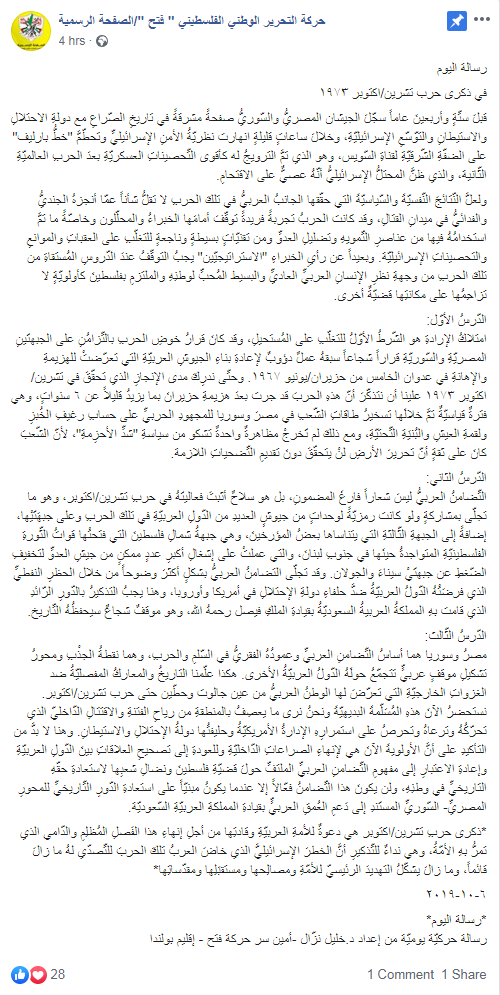 Posted text: “The anniversary of the October War (i.e., the 1973 Yom Kippur War) is a call to the Arab nation and its leaders to end this dark and bloody chapter that the nation is going through; it is a call to remind [us] that the Israeli danger that the Arabs fought that war in order to confront still exists, and constitutes the central threat to the [Arab] nation, its interests, its future, and its holy sites.”