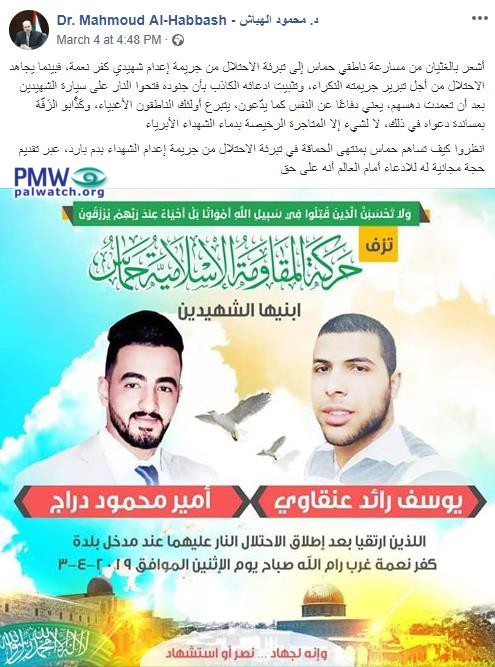 Posted text: "I feel sick over the Hamas spokespeople hurrying to exonerate the occupation of the crime of executing the two Martyrs (Shahids) in Kafr Ni’ma. While the occupation is striving to justify its despicable crime and prove its false claim – according to which its soldiers shot at the car of the two Martyrs after it deliberately ran them over, in other words, it was self-defense, as they claim – these stupid spokespersons and wedding liars (refers to belief in Islam that Martyrs marry the 72 virgins in paradise -Ed.) are supporting its claim in this matter, just to trade cheaply in the blood of the innocent Martyrs.