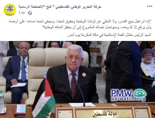 Posted text: "[PA President Mahmoud Abbas:] 'We will never agree to sell Jerusalem or to renounce the national bedrocks and our people’s rights. Our people will continue to stand firm on its land and will never bow to anyone but Allah alone, and will continue its legitimate struggle until it realizes its national goals.'