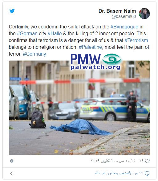 The article includes a screenshot of an Oct. 10, 2019 tweet from the Twitter account of Hamas International Relationship Office member Basem Naim, which shows a picture of the body of a victim of the Halle terror attack and the following text in English: “(All errors in source –Ed.) Certainly, we condemn the sinful attack on the #Synagogue in the #German city #Halle & the killing of 2 innocent people. This confirms that terrorism is a danger for all of us & that #Terrorism belongs to no religion or nation. #Palestine, most feel the pain of terror. #Germany”