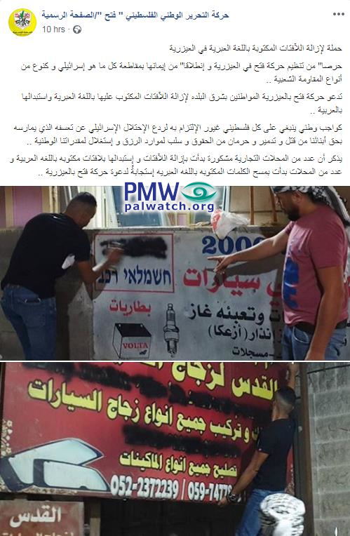It should be noted that a number of praiseworthy businesses have begun to remove the signs and replace them with signs in Arabic, and a number of businesses have begun erasing the words written in Hebrew in response to the call of Fatah in Al-Eizariya.”