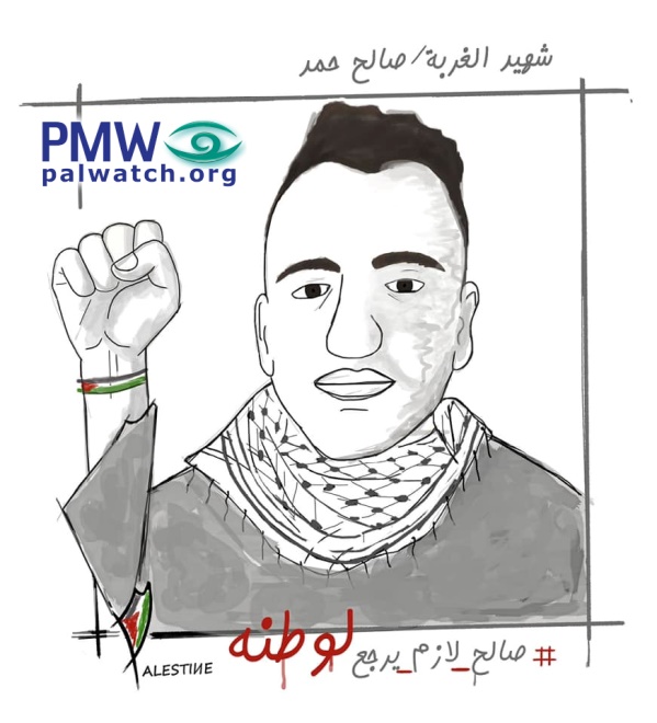 The cartoon shows Saleh Hamad, a Palestinian who attempted to emigrate from the Gaza Strip and drowned in the Mediterranean Sea. Hamad is wearing a keffiyeh (Arab headdress) around his neck and holding up a fist with a Palestinian flag wristband on his wrist, and his sleeve is in the shape of the PA map of “Palestine” that presents all of Israel and the PA areas as “Palestine.” Below his elbow is the word “Palestine” in English with the PA map of “Palestine” in the “P” of the word “Palestine.”