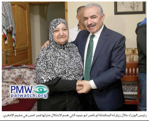 "[PA] Prime Minister Muhammad Shtayyeh yesterday, Thursday [Oct. 24, 2019] visited fighter Um Nasser Abu Hmeid (i.e., mother of terrorists responsible for at least 10 murders; see note below), whose house the occupation demolished early yesterday morning in the Al-Amari refugee camp.