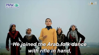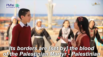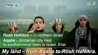 Palestinian Authority child abuse continues. A music video on official PA TV uses children to promote the ideal of dying as Martyrs for "Palestine," whose borders are set by "the blood of the Palestinian Martyr." The song also mentions the one who "joins the dance, rifle in hand." Furthermore, the song anticipates a time when Israel will no longer exist, defining as "Palestine" the area between Rosh HaNikra in north-western Israel and Aqaba, the Jordanian city next to Israel's southernmost town Eilat.