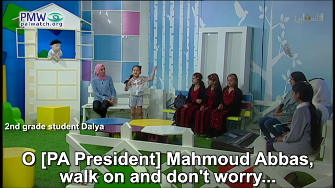 Similarly, a Palestinian girl in 2nd grade recited a poem on official PA TV's children's program The Best Home, which illustrates that Palestinian kids are still taught to venerate the rifle and to be prepared to sacrifice themselves - their "blood" - for "Palestine." The girl recited that she "learned the art of the rifle," and addressing Mahmoud Abbas, she recited: "By Allah, my blood is your blood":