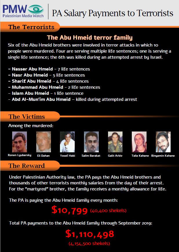 The PA has supported the Abu Hmeid family generously by paying salaries to the 5 terrorist-murderer sons serving prison sentences and by paying a monthly allowance to the family for a sixth son who died as "a Martyr." As part of the PA's "Pay-for-Slay" reward program, it pays the family 40,400 shekels/month ($10,800). Over the years, through September 2019, the PA has paid the family at least 4,154,500 shekels ($1,110,498).