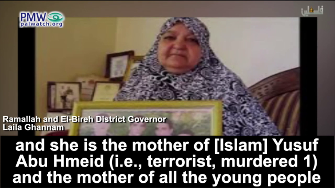 The most recent show of this infinite endorsement has come from the very top of the PA - from the Prime Minister himself - to Um Nasser Abu Hmeid who is the mother of 6 terrorists responsible for at least 10 murders.