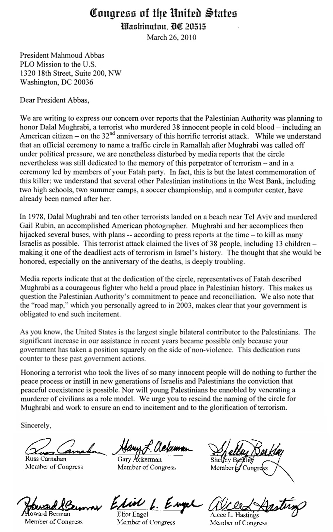In addition, twenty US Congress members wrote a letter to Abbas on March 26, 2010, condemning the naming of the square: