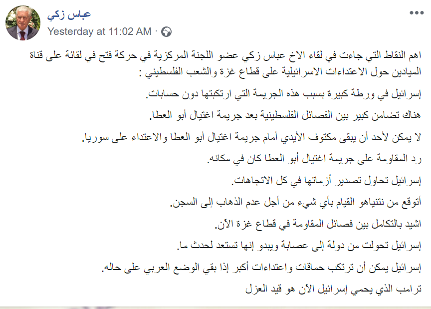 Posted text: “The main points that were noted by Fatah Central Committee member brother Abbas Zaki in his interview with [Lebanese] Al-Mayadeen TV regarding the Israeli attacks against the Gaza Strip and the Palestinian people: