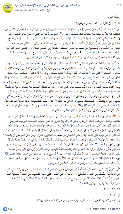 Text posted on the official Fatah Facebook page, written by Secretary of Fatah’s Branch in Poland Khalil Nazzal