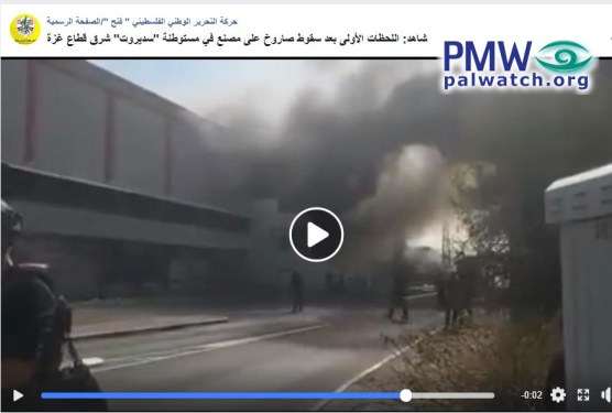 Posted text: “Watch: The first moments after a rocket hit a factory in the settlement of ‘Sderot’ (i.e., a town in southwestern Israel), east of the Gaza Strip”