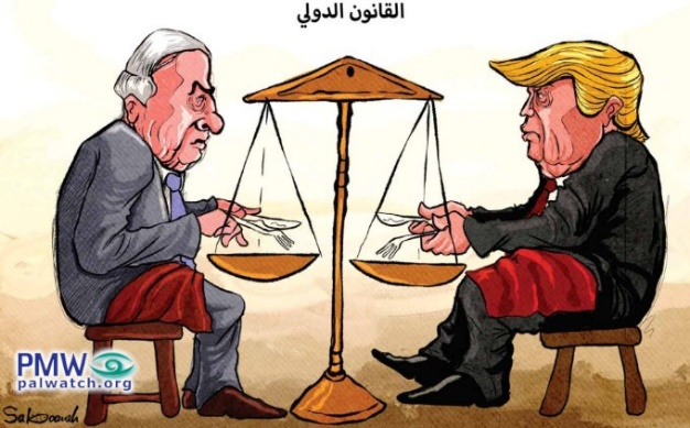 Palestinian Authority daily cartoon: Trump and Netanyahu feast on international law