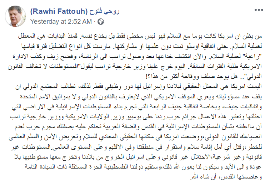 Text posted on the Facebook page of Fatah Central Committee member Rawhi Fattouh