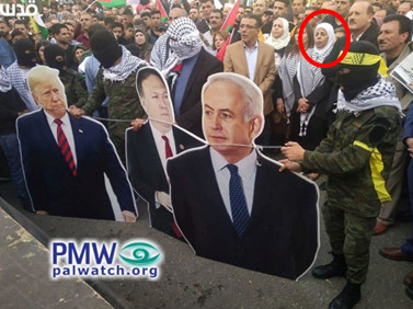 Many Palestinians took to the streets to participate in the “Day of Rage,” including Fatah Central Committee member and Fatah Commissioner of NGOs Dalal Salameh, who joined the ceremonial burning of images of US President Trump, US Secretary of State Pompeo, and Israeli Prime Minister Netanyahu in Nablus.