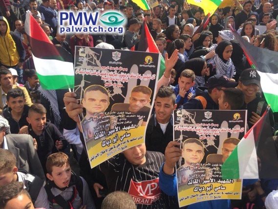 Text on posters in photo of kids at “Day of Rage” rally: “The [PLO] Commission of Prisoners’ Affairs, the Fatah Movement – Jenin branch, and the [PA-funded] Prisoners’ Club are leading [the way] with great pride to the wedding (i.e., Martyr's funeral is considered wedding to the 72 Virgins in Paradise in Islam) of Martyr prisoner leader Sami Abu Diak, who was executed in the Israeli occupation prison by medical means on Nov. 26, 2019 (sic., Abu Diak died of cancer despite treatment he received in prison from Israel).”