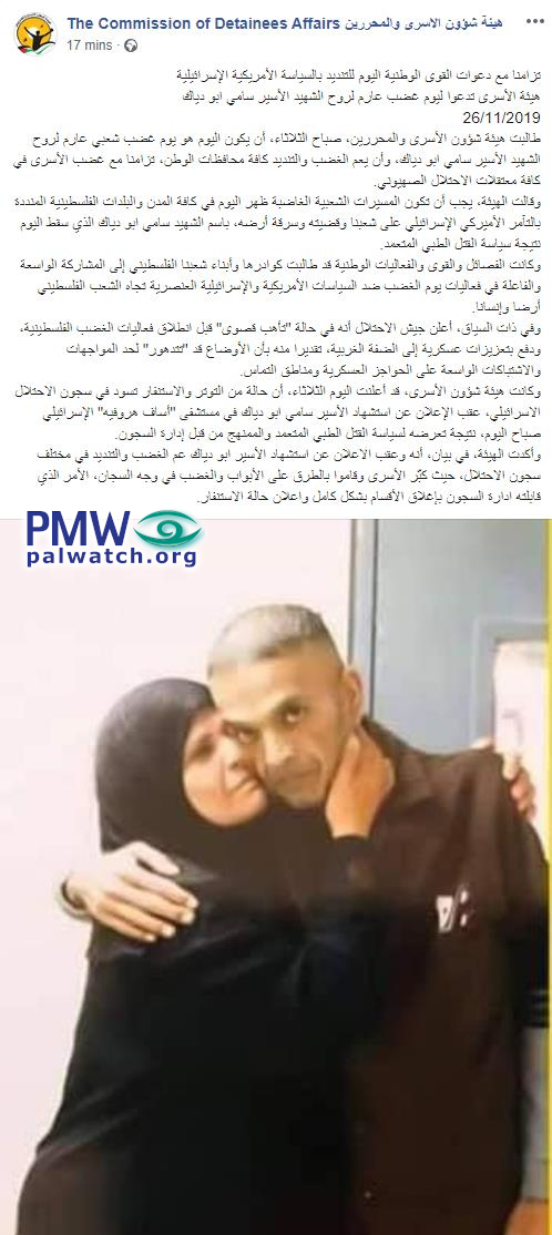 Posted text: “The [PLO] Commission of Prisoners’ Affairs demanded on Tuesday morning [Nov. 26, 2019] that today be a day of popular rage and strength for the soul of Martyr prisoner Sami Abu Diak (i.e., he was serving 3 life sentences; see note below). It demanded that the rage and condemnations prevail in all districts of the homeland, together with the prisoners’ rage in all of the Zionist occupation’s detention camps.