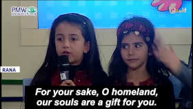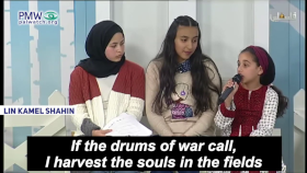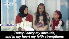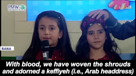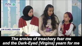 One poem, recited by a girl probably not more than 10 years old, taught that Palestinian kids – “lion cubs” – should use violence and fight with a “drawn” sword that “won’t return to the sheath.” The poem further told the kids that they have “the blood of the Martyrs” in their veins, and reminded them that according to Islam, the 72 virgins of Paradise – “the Dark-Eyed” - are “yearning” for them, and appreciate them when they die as Martyrs. The poem further stressed the ideal and urgency of seeking death – even right now – as it stated that “today I carry my shrouds.” Representing Palestinian adult approval, the PA TV host enthusiastically applauded the girl: