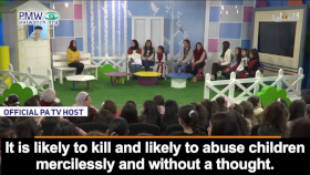 Host: “You know how the occupation behaves. It is likely to kill and likely to abuse children mercilessly and without a thought. Therefore, there must be an adult with us… Our rights [in the Convention on the Rights of the Child] are being violated - the right to life, the right to protection... Unfortunately, dear children, [the fact that] these rights are being violated does not reach the world… They don’t know that the Israelis are violating the right to life by killing children on an almost daily basis.”