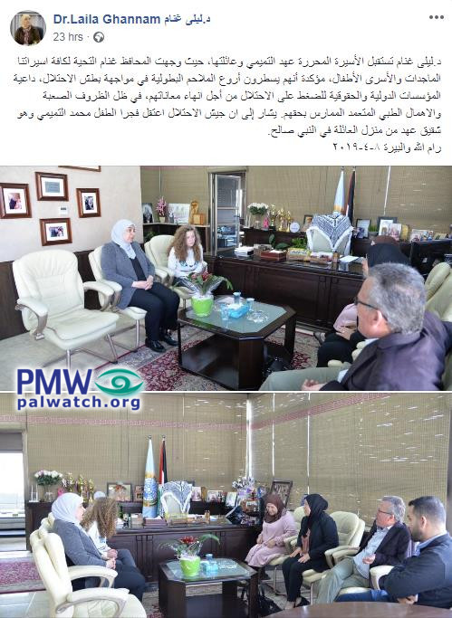 Posted text: "[District Governor of Ramallah and El-Bireh] Dr. Laila Ghannam hosts released prisoner Ahed Tamimi (i.e., Palestinian teen who assaulted Israeli soldiers and promoted suicide bombings) and her family. District Governor Ghannam conveyed her blessings to all of the praiseworthy female prisoners and the child prisoners by saying that they are writing the most spectacular stories of heroism in the face of the occupation's cruelty. She called on the international institutions and the human rights organizations to put pressure on the occupation in order to put an end to their suffering given the difficult conditions and the deliberate medical neglect being carried out against them. It should be noted that the occupation army arrested the child Muhammad Tamimi, Ahed's brother, this morning [April 8, 2019] at the family's home in Nabi Saleh.