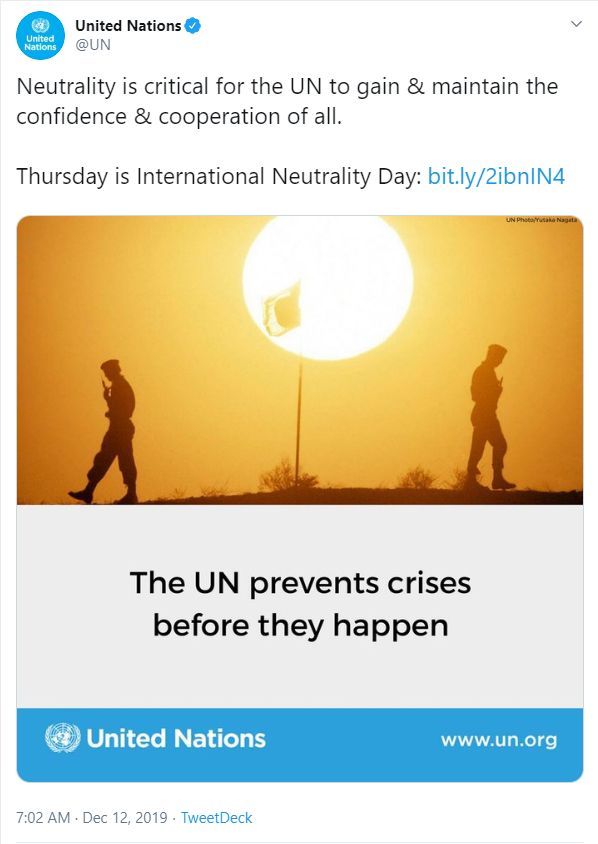 Today the UN marks International Neutrality Day, stressing that “Neutrality is critical for the UN to gain & maintain the confidence & cooperation of all.” In direct contrast to this statement, just yesterday, Dec. 11, 2019, the UN together with the Palestinian Authority launched a $348 million appeal “to address critical humanitarian needs of Palestinians.”