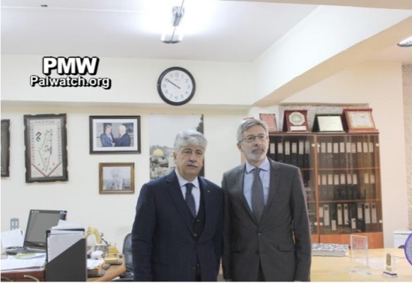 The article includes a picture of French Consul General in Jerusalem Pierre Cochard standing with PLO Executive Committee member Ahmed Majdalani in Majdalani’s office. On the left end of the wall behind them is hanging the PA map of “Palestine” that presents all of Israel as “Palestine” together with the PA areas.