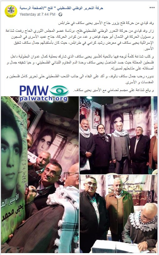 Posted text: “A Fatah Movement leadership delegation visited the prisoner Yahya Skaf wing in Tripoli (i.e., Skaf was a terrorist who participated in murder of 37, 12 of them children)