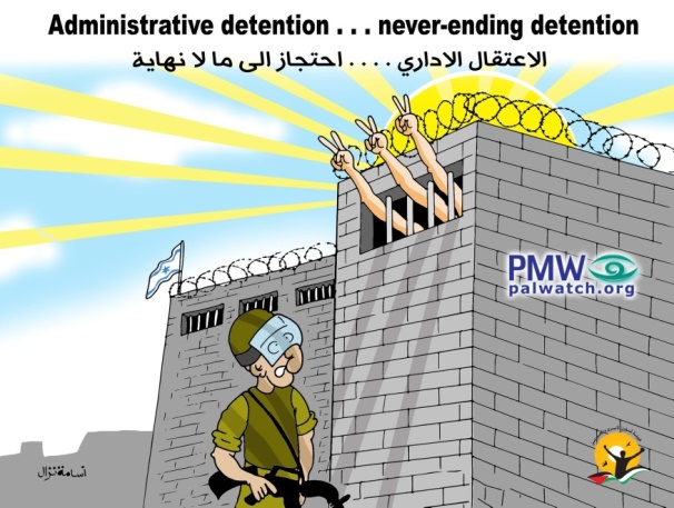 Text on cartoon in Arabic and English: “Administrative detention… never-ending detention”