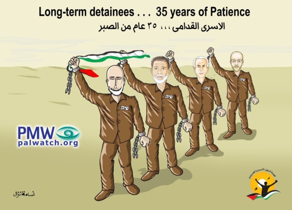 The cartoon shows four prisoners walking in a line in the desert with broken chains hanging from cuffs on their arms; the first prisoner in the line is holding a Palestinian flag. From left to right the prisoners are: apparently Raed Al-Sa’adi – a senior member of the Islamic Jihad terror organization; Nael Barghouti – a terrorist who murdered 1 together with an accomplice; and Karim and Maher Younes – terrorists who together murdered 1.