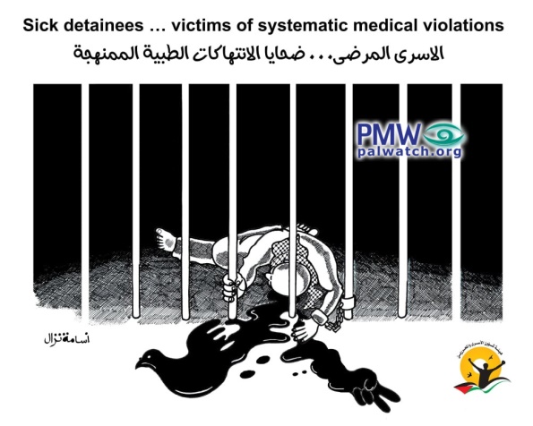Text on cartoon in Arabic and English: “Sick detainees… victims of systematic medical violations”