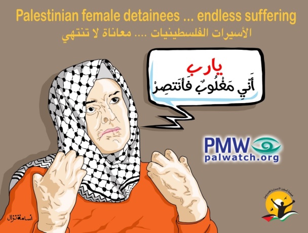 Text on cartoon in Arabic and English: “Palestinian female detainees… endless suffering”