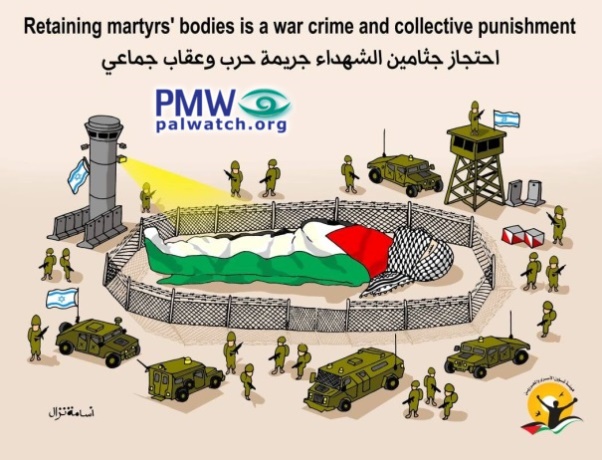Text on cartoon in Arabic and English: “Retaining martyrs’ bodies is a war crime and collective punishment”