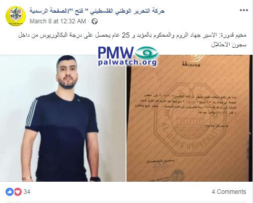 Posted text: “Qadura refugee camp: Prisoner Jihad Al-Roum (PMW was unable to verify the details of his crimes –Ed.), who was sentenced to life and 25 years, receives a bachelor’s degree inside the Israeli prison.”