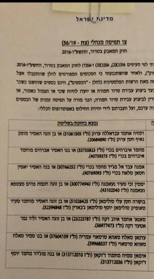 “Administrative Seizure Order (S.O. – 56/19) War on Terror Law, 5776-2016