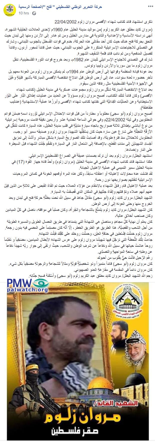 Posted text: “The anniversary of the death of Al-Aqsa Martyrs’ Brigades (i.e., Fatah's military wing) commander Marwan Zalum, April 22, 2002…