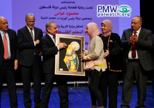 “Female student Maira Luay Ghneim won the Creativity and Excellence Prize (first place) for the most beautiful plastic painting in the framework of a competition thatthe Palestinian [PA] Ministry of Education organized on the national level for Palestinian Teacher’s Day. Artist Ghneim won the prize of the Ministry of Education’s judging committee, which included prominent Palestinian plastic artists, for a painting representing the Palestinian teacher’s struggle in building the pillars of knowledge. Palestinian [PA] Prime Minister Dr. Muhammad Shtayyeh presented the prize to artist Ghneim during a ceremony for Palestinian Teacher’s Day in Ramallah.”