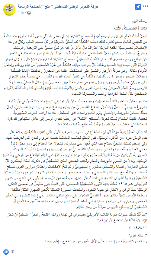 Text posted on the official Fatah Facebook page, written by Secretary of Fatah’s Poland Branch Khalil Nazzal