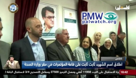 Visual: Text at bottom of screen: “The conference room at the [PA] Ministry of Health headquarters is named after Martyr Thabet Thabet”