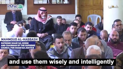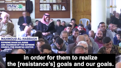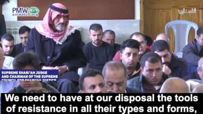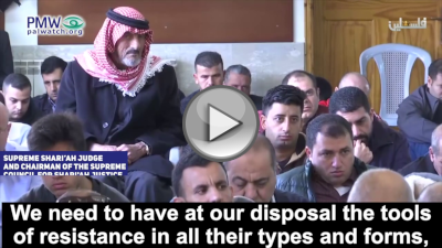 PA Chairman Abbas’ former advisor and current head of the PA’s Shari’ah courts Mahmoud Al-Habbash instructed Palestinians in a sermon that they must use “all forms” of “resistance.”Palestinian Media Watch has documented that terms such as "all means” or “all forms of resistance" - when used by PA leaders - include all types of violence. The terms refer to everything from deadly terror against Israeli civilians such as stabbings and shootings, throwing rocks and Molotov Cocktails - alongside other means of “resistance” such as diplomacy and negotiations.