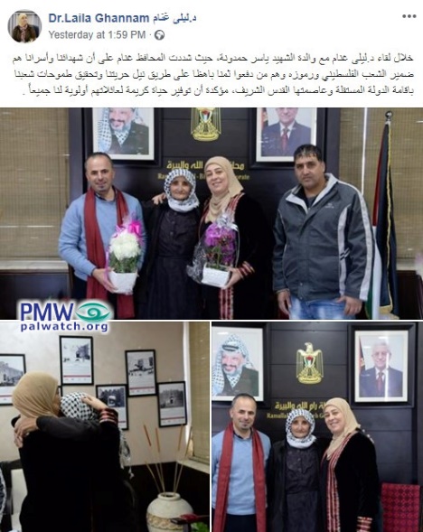 Posted text: "During [Ramallah and El-Bireh District Governor] Dr. Laila Ghannam's visit with the mother of Martyr Yasser Hamdouni (i.e., terrorist, participated in murder of 1), District Governor Ghannam emphasized that our Martyrs and prisoners are the conscience of the Palestinian people and its symbols, and that they are the ones who have paid a heavy price on the path to our freedom and the realization of our people's aspirations: the establishment of an independent state whose capital is Jerusalem. She emphasized that the concern for dignified lives for their families is a priority for all of us."