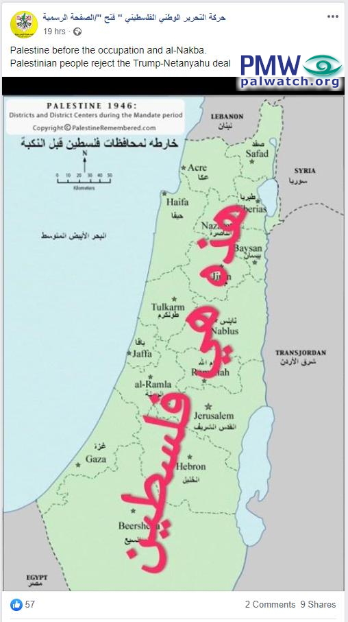 Fatah post against Trump pace plan shows map of British Mandate Palestine, presents it as map of non-existent country of “Palestine”