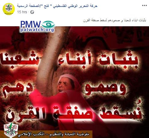 The image shows a woman holding onto a tree. In the bottom left is the Fatah logo that includes a grenade, crossed rifles, and the PA map of “Palestine” that presents all of Israel as “Palestine” together with the PA areas. To the right of the logo is written: “[Fatah] Mobilization and Organization Commission – Information Office”