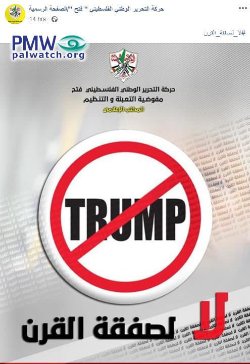 The image shows a large prohibition sign with the word “Trump” crossed out in it, with the words “no to the deal of the century” repeating in the background. At the top is the Fatah logo that includes a grenade, crossed rifles, and the PA map of “Palestine” that presents all of Israel as “Palestine” together with the PA areas. Under the logo is written: “Palestinian National Liberation Movement ‘Fatah’