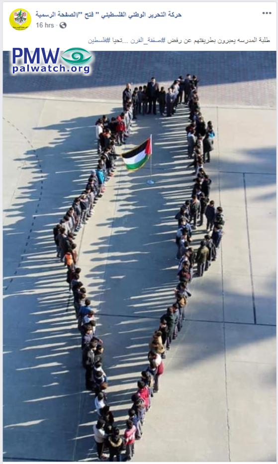 The image shows schoolchildren forming the shape of the PA map of “Palestine” that presents all of Israel as “Palestine” together with the PA areas. In the middle of the map is a Palestinian flag.