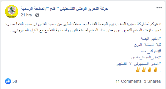 Fatah post against Trump peace plan and “normalization with the Zionist entity”