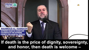 Al-Habbash: “Might we accept this [the deal of the century]? …We will stand before two choices: Either we will succumb on our own and humiliate ourselves, and we will receive shame for eternity – or we will say, as our chosen beloved [Prophet Muhammad] said: ‘I will fight them… until my head falls and I am dead.’ …There is no one among us who can choose the first option… They say that they will declare the ‘plot of the century’ within days… The Palestinian leadership has said clearly and definitely: If they harm our rights in this deal of shame – then the [PA] leadership will take steps... Die – but upright like a tree… Die while you are honorable, die with your head held high… Their goal [in the past] was that the Palestinians would sign on their agreement to the occupation of Palestine… No, this will never happen… We welcome death for the sake of Allah. If death is the price of dignity, sovereignty, and honor, then death is welcome – if it is for Allah and in the way of Allah’s Messenger [Muhammad] who swore to fight the infidels until he died… The Palestinian hand has not yet been created that can sign this deal of shame.”