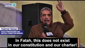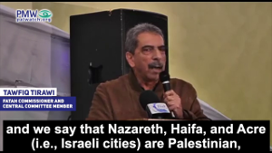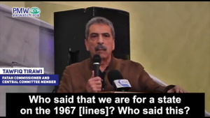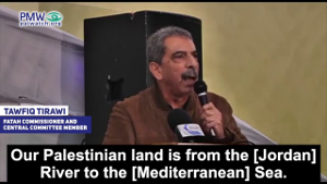 Fatah Commissioner and Central Committee member Tawfiq Tirawi: “Who said that we are for a state [on the borders of] 1967? Who said this? In Fatah, this does not exist in our constitution and our charter! They [Israel] want Beit El and Ma’ale Adumim (i.e., Israeli towns in the West Bank) to be Israeli, and we say that Nazareth, Haifa, and Acre (i.e., Israeli cities) are Palestinian, and they will remain Palestinian! Our Palestinian land is from the [Jordan] River to the [Mediterranean] Sea. I dare any Palestinian, any senior Palestinian official, or any Palestinian leader to reduce the Palestinian map to the West Bank and Gaza! He would not be able to walk one meter in the streets of our Palestinian cities among our people! … Arab brothers… Be with the Palestinian people, the people that lives on land that is all holy and that is all waqf land (i.e., land that is an inalienable religious endowment in Islamic law.)”