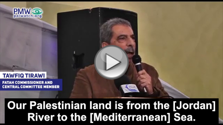 Fatah leaders say to the international audience that they want a “Palestine” on the 1967 lines, but to Palestinians they stress that they will never accept Israel in any borders.Palestinian Media Watchhas exposed PA and Fatah leaders repeating the sloganthat “Palestine reaches from the River to the Sea”: