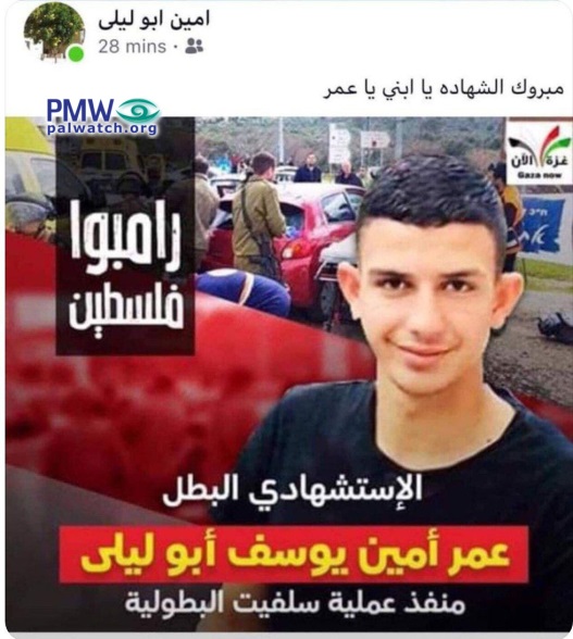 Text on center bottom of image: "Heroic Martyr (Shahid) Omar Amin Yusuf Abu Laila, who carried out the heroic Salfit operation (i.e., terror attack)"