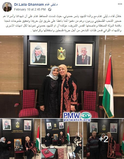 Posted text: "From [District Governor of Ramallah and El-Bireh] Laila Ghannam's visit with the mother of Martyr Yasser Hamdouni (i.e., terrorist, murdered 1 together with an accomplice), during which Governor Ghannam emphasized that our Martyrs and prisoners are the Palestinian people's conscience and symbols, and that they are the ones who have paid a heavy price on the path to achieving our freedom and achieving our people's aspirations – the establishment of an independent state whose capital is Jerusalem. She emphasized that Martyr Hamdouni's mother is an example for all mothers of prisoners and Martyrs who have sacrificed the fruit of their loins for Palestine's freedom, independence, and honor."
